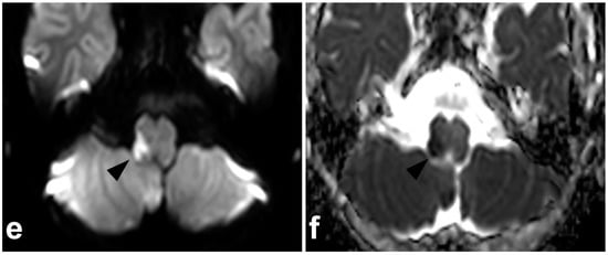 (a) Axial T2-weighted. (b) Axial plane of an isotropic fat-saturated T1-weighted (black blood sequence). (c) Right-sided off-midline sagittal STIR. (d) Left-sided off-midline sagittal STIR. (e) Axial trace diffusion-weighted image of the brain. (f) Axial apparent diffusion coefficient map of the brain. A 5-year-old male, found with impaired consciousness in unclear circumstances. MRI was performed to exclude trauma and revealed an occluding dissection of the right vertebral artery. The occluded right vertebral artery lacked a normal flow void on T2-weighted and STIR images (white arrows), while the patent left vertebral artery presents a normal flow void (white arrowhead). T1 fat-saturated sequence (b) reveals an intramural hematoma with a bright T1 signal in the wall of the dissected artery caudally to the completely occluded segment (curved arrow). Diffusion-weighted brain imaging demonstrates right-sided pontine infarction as a sequel to vertebral artery occlusion (black arrowheads). No other findings were suggestive of acute injury in the cervical spine or in the brain. The cause of the dissection remains unknown.