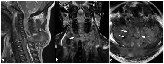 (a) Sagittal T2-weighted. (b) Coronal STIR. (c) Axial T2-weighted (dotted line in the image (a)). A 2-year-old female, severe cervical fracture–dislocation after a car accident. The spinal cord is transected. The cord caudally to the transection site (arrows) is dislocated posteriorly and on the right side of the cranial end of the transected cord (arrowhead). An extensive hematoma is seen around the fracture.