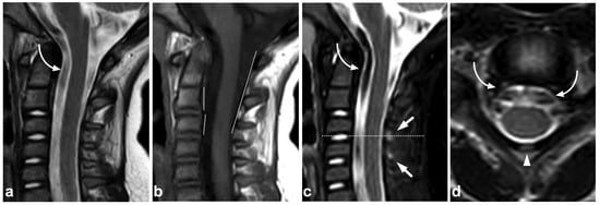 Our routine imaging protocol includes sagittal T1- and T2-weighted, sagittal and coronal STIR, and axial T2-weighted. In the case of either clinical or radiological suspicion of a ligamentous injury in the upper cervical spine and craniocervical junction, the following series with a small field of view (FOV) are obtained: sagittal and coronal PD-weighted and axial T2-weighted. Contrast media are not used in the routine protocol. The device used is a Philips Ingenia 3 Tesla scanner with a Philips dStream coil system (Philips Healthcare, Best, The Netherlands). Detailed specifications of the routine sequences adopted in our clinical practice can be found in Supplementary Table S1.