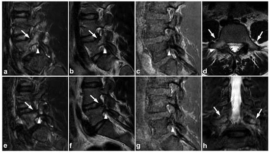 (a) Sagittal right-sided off-midline STIR. (b) Sagittal right-sided off-midline T2-weighted. (c) Sagittal right-sided off-midline black bone sequence. (d) Axial T2-weighted. (e) Sagittal left-sided off-midline STIR. (f) Sagittal left-sided off-midline T2-weighted. (g) Sagittal left-sided off-midline black bone sequence. (h) Coronal STIR. A 12-year-old female with acute lower back pain when playing with friends. MRI demonstrates bilateral bone marrow edema centered in pars interarticularis (arrows). Fracture lines are also seen bilaterally in the pars (arrowheads). No spondylolisthesis is present.