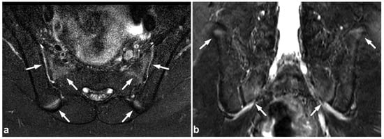 Juvenile lumbar spondylolysis ensues from repetitive stress, but the onset of symptoms can be sudden, and the chronic pain may be exaggerated by acute trauma. The clinical presentation and the typical location of the findings centered in the pars interarticularis help to distinguish a stress injury from an acute traumatic fracture. The spondylolysis and surrounding bone marrow edema can probably be assessed with MRI [], but the evidence of MRI’s sensitivity is not fully concurrent []. However, it seems that MRI’s performance can be improved with high-resolution T1-weighted sequences optimized for bony structures [] or with a novel ultrashort time-to-echo technique []. An example of a lumbar spondylolysis is presented in Figure 19. Targeted small-FOV CT may be used in estimating the age, grade, and bony union rate of the spondylolysis in treatment planning and follow-up [,,,,].