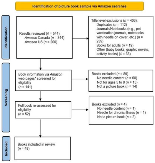Two primary key terms (“Needle and Health”, “Doctor and Shot”) and three secondary key terms (““Needle” and “Vaccine””, “Vaccine”, “Check up”) were searched on Amazon, an online retailer that has been used to identify a sample in other similar studies [37,38,39]. The searches were conducted between 19 May and 23 May 2022. The first 100 results were reviewed for primary key terms followed by the first 50 results from secondary key term searches. Key terms were searched in the order listed above within the Children’s book section on Amazon Canada (primary, then secondary) followed by Amazon US (primary only due to repetitions). The picture book and English language filters were also turned on to refine each search. Search results were reviewed in the order featured on the website with any sponsored results automatically excluded; of note, the sponsored exclusions were not tracked; however, books that were “sponsored” (and, therefore, excluded) could also show up within the search results if relevant, and these were considered for inclusion. The books were first screened via Amazon web pages; for books meeting the inclusion criteria, the full book was obtained by purchasing a hard copy or e-book through Amazon or from a local library, when available. Full books were then assessed according to the previous screening criteria. Figure 1 outlines each stage of the screening process.