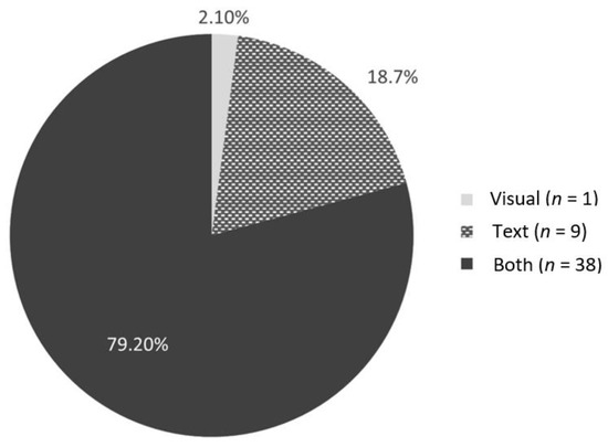 The books were published from 1981 to 2022; however, most (81.3%, n = 39) were published after 2015. The majority (64.6%; n = 31) are available in both hard copy and e-book formats. The average cost of the hard copy books was CAD 14.11 (Median = CAD 12.99, range = CAD 6.92 to 25.77), whereas the average cost of the e-books through KindleTM was CAD 4.15 (Median = CAD 6.19, range = CAD 0.99 to 9.99). Needle-related information and experiences were most often represented both visually and in text (Figure 2), and the majority of the sample (77.1%, n = 37) featured a character and narrative. A small number of books (6.3%, n = 8) did not depict a story line and were primarily educational information for children.