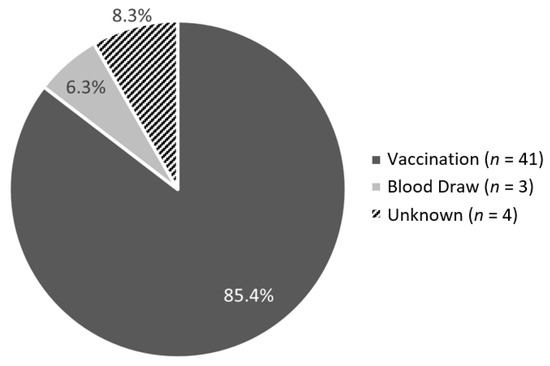 Figure 3 represents the breakdown of the types of needle procedures referenced in the sample, with the majority being vaccinations (85.4%, n = 41). The setting of each book was also examined to understand the context within which needles are typically presented. Most needle procedures (75%, n = 36) were set in a doctor’s clinic, hospital, or general exam room setting. Three books (6.3%) depicted the needle procedure in a school setting. No needle procedures were set within the home. The remaining books (10.4%, n = 5) fell into the “other” category and depicted random or unclear locations (e.g., field, boat, dream, etc.). In 66.7% of the sample (n = 32), only the needle procedure was referenced or depicted, whereas almost a third of the books (31.3%, n = 15) also included other procedures that commonly occur at doctor’s appointments such as checking height and weight, vision, breathing, and testing reflexes.