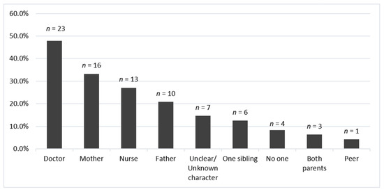 Regarding characters present during the procedure, a caregiver figure was present in 45.8% of the books (n = 22); of these, mothers were represented the most (72.7%, n = 16). Within clearly depicted healthcare providers, only doctors and nurses were represented. The list of coded characters is reflected in Figure 4.