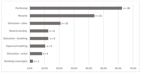 All 48 books (100%) included at least one evidence-based strategy for coping with needle fear, as reflected in Figure 5. Using upright positioning was commonly depicted (>60%). Forms of distraction beyond breathing, media, and verbal distraction were depicted or described in a fifth of the sample (20.8%, n = 10) and most often included guided imagery or visualization (e.g., picture self as a brave lion, imagine fish swimming in ocean), or singing. No distraction via media or technology (e.g., tablets, VR, phones, etc.) was depicted.