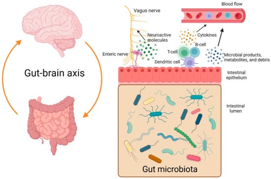 Figure 1. The gut-brain axis and the bidirectional communication between the gastrointestinal tract and the central nervous system (created with BioRender.com, accessed on 6 May 2023).