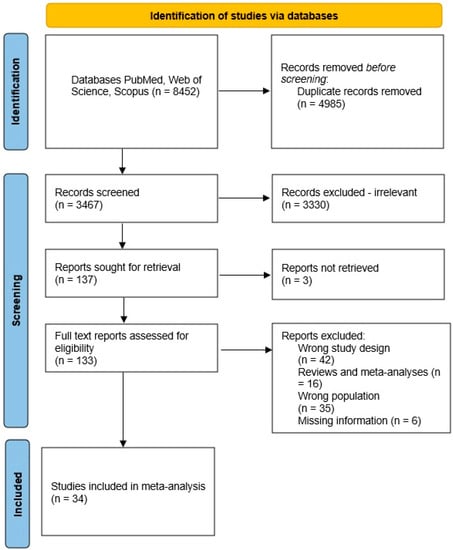After completing the search, a total of 2688 studies were obtained from PubMed, 3606 studies from Web of Science, and 2158 studies from Scopus (Figure 2). Then, we detected duplicate studies and checked the studies for eligibility based on their titles and abstracts, excluding those that did not meet the inclusion criteria. In total, there were 34 studies that met the inclusion criteria. Information about the included studies is presented in Supplementary Table S1. The top ten genera, which were reported most times in the articles as significantly different, either decreased or increased levels in the gut, are listed below.
