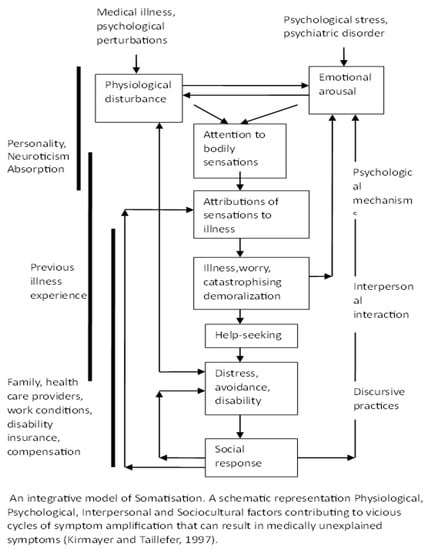 - Chander, K.R.; Manjunatha, N.; Binukumar, B.; Kumar, C.N.; Bada Math, S.; Janardhan Reddy, Y. The prevalence and its correlates of somatization disorder at a quaternary mental health centre. Asian J. Psychiatry 2019, 42, 24–27. [Google Scholar] [CrossRef]