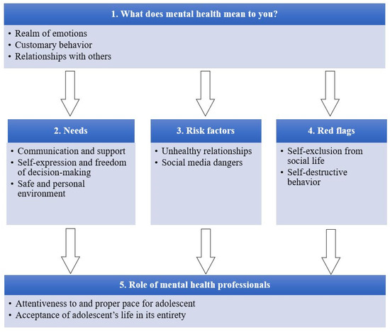 Most adolescents define mental health as the ability to control their emotions and adjust their behavior according to societal and age norms, which is reflected in the quality of their relationships with other people. Assessment of adolescent mental health is also revealed through essential needs: supportive communication with significant people, a sense of a safe and private space, and the opportunity to engage in pleasant activities that help self-expression. Adolescents single out bullying and un-pleasant and annoying mutual communication from peers or adults as the most harmful factors for mental health. At the same time, time spent on social media and its harmful content can affect adolescents’ perceptions of the environment and themselves. Key risk factors that can help predict poor adolescent mental health include withdrawal, non-social behavior, and risky substance- or self-harm-related behaviors. To strengthen mental health, adolescents play a significant role in mental health care. Teenagers expect from professionals simple, un-hurried communication and a detailed conversation about important, significant aspects of life for a teenager.