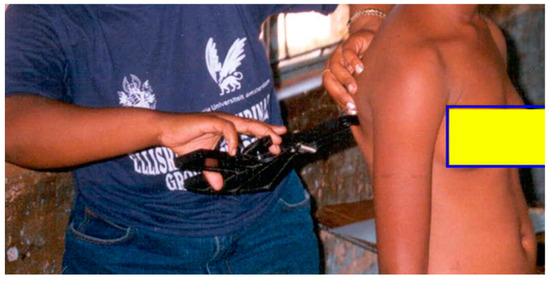 Biceps were measured over the triceps muscle, on the anterior mid-acromiale-radiale line of a relaxed arm, with the shoulder joint slightly rotated externally as shown in Figure 2 [17].