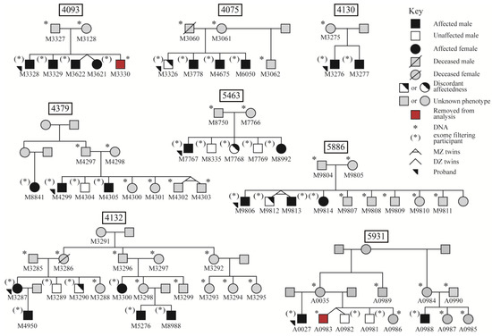 Individuals from eight families in the larger study (n = 74) were included in the current study. A subset of the individuals (n = 36) have completed the TEGI (age-referenced for children ages 3 to 8; 11 years), the phenotype of interest, at least once (Figure 1) [15]. Two siblings (both males) were excluded from the subset due to potentially confounding patterns of lowered NV-IQ (Figure 1). The remaining individuals (Table S2; n = 34; 27 males and 7 females; referred to as TEGI-WES group) were the focus of the WES variant filtering (Figure 2). All eight probands (7 males and 1 female) are affected on the TEGI based on their elicited grammar composite or screener score, six of whom are affected according to both scores (Figure 1).