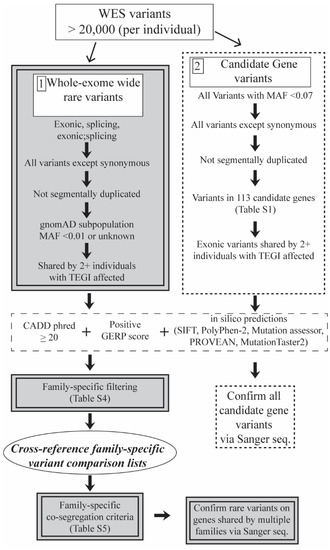 The following supporting information can be downloaded at: https://www.mdpi.com/article/10.3390/children10071119/s1, Table S1: Candidate Gene List (n = 113, based on a combination of reviews); Table S2: Distribution of Affectedness Across the Four Possible Phenotypes in the Whole exome Sequenced Individuals (n = 34); Table S3: Distribution of Affectedness Across the Four Possible Phenotypes in the Additional Probands (n = 146); Table S4: Family-specific Criteria for ‘family-specific variant comparison lists’; Table S5: Family-specific Criteria applied for ‘co-segregating variant lists’; Table S6: Primers used for confirmation via sequencing; Table S7: Number of Rare Variants: Familywise Filtering Workflow 1; Table S8: 47 Genes Resulting from Cross-Referencing of ‘Family-Specific Variant Comparison Lists’; Table S9: Summary of 44 Variants on 23 Genes Prioritized from Filtering Workflow 1 Cross-referenced List; Table S10: Summary of Prioritized Variants from Filtering Workflow 1 Sequenced and Confirmed in Family Members; Table S11a: 18 Rare Variants Prioritized in Family 4093 Shared by All Four Family Members Affected on the TEGI; Table S11b: 31 Rare Variants Prioritized in Family 4130 Shared by Both Family Members Affected on the TEGI; Table S11c: 31 Rare Variants Prioritized in Family 4132 Shared by Two or More Family Members from Different Branches Affected on the TEGI; Table S11d: 37 Rare Variants Prioritized in Family 4075 Shared by Three or More of the Four Family Members Affected on the TEGI. Table S11e: 17 Rare Variants Prioritized in Family 4379 Shared by Two or More of the Three Family Members Affected on the TEGI; Table S11f: 6 Rare Variants of Large Effect Prioritized in Family 5463 Shared by All Three of the Four Family Members Affected on the TEGI; Table S11g: 23 Rare Variants Prioritized in Family 5886 Shared by All Four of the Four Family Members Affected on the TEGI; Table S11h: 18 Rare Variants Prioritized in Family 5931 Shared by Both Family Members Affected on the TEGI; Table S12: Number of Candidate Gene Variants: Familywise Filtering Workflow 2b; Table S13: Summary of Confirmation Notes for the 13 Variants Prioritized from Filtering Workflow 2 Output Sequenced in Family Members; Table S14a: Number of Variants on Chromosome 3q13.12-q13.31: Familywise Filtering Workflow 2a; Table S14b: Variants prioritized familywise within RD region: chr3q13.12-q13.31, previously significantly associated with TEGI phenotype; Table S14c: Number of Variants on Chromosome 6p21.1-p22.3: Family Filtering Workflow 2a; Table S14d: Variants prioritized familywise within RD region: chr6p21.1-p22.33q13.12-q13.31, previously significantly associated with TEGI phenotype; Table S14e: Primers used for confirmation of variants in RD regions via sequencing.