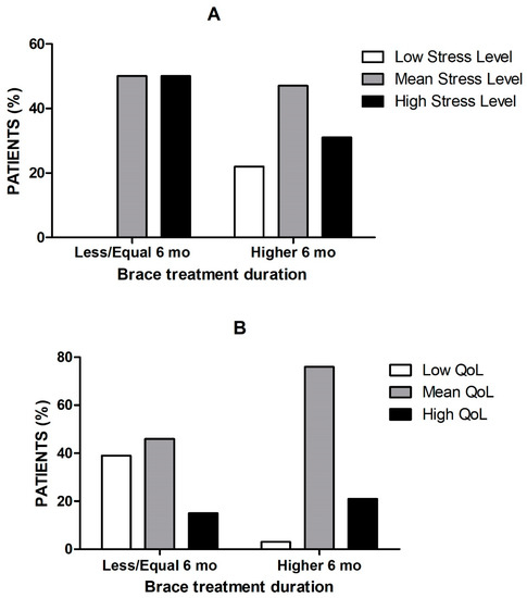 Scoliosis per se has the potential to adversely affect many psychological aspects in adolescents and is currently recognized as an important risk factor for psychic discomfort and poor quality of life (QoL). Thus, AIS patients may experience both physical and psychological stress as well as social isolation, depression, and reduced participation in leisure activities [3]. In addition, it has been reported that brace-associated factors may interfere with several aspects of patients’ well-being. Brace external visibility, perceived pain, neurological complications, respiratory discomfort, and emotional distress are among the most common aspects, all of which may lead to variable levels of stress and negatively impact every-day life [4,5,6]. Hence, AIS-related stress levels and poor QoL could be worsened by brace wearing for many hours a day, which in turn may affect patients’ adherence to treatment and lead to disease progression [7]. A number of validated questionnaires specifically targeted to brace-wearing scoliotic populations are available, including the Bad Sobernheim Stress Questionnaire—Brace (BSSQ) and the Italian Spine Youth Quality of Life for “brace” domain (ISYQoL), which have been successfully used in AIS patients to evaluate the short-term effect of brace-related stress level and QoL, respectively [8,9]. It is known that stress associated with brace wearing can deteriorate self-confidence and decrease the activity of AIS patients but it has also been suggested that, after the initial shock of being conscious about the spine deformity and its treatment, the psychological effects of brace wearing tend to decrease [10,11]. However, to the best of our knowledge, whether brace wearing duration has an effect on brace-related levels of stress and QoL has not yet been investigated.