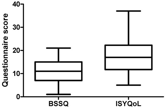 Box-and-whiskers plot of BSSQ (mean 11.26 ± 5.13; 95% CI 9.74–12.78) and ISYQoL (mean 17.59 ± 7.18; 95% CI 15.45–19.72) overall scores in the whole study population (n = 46). No significant correlation between BSSQ and ISYQoL was found by using the non-parametric Spearman test (r = −0.221 (95% CI −0.49–0.08) p = 0.14, NS).