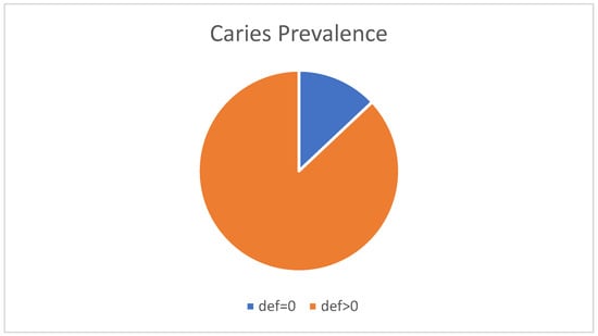 The reported results agree with other studies carried out in other continents [,,] where the high prevalence and experience of dental caries in primary dentition have been associated with both individual and environmental risk factors, such as high sugar consumption, malnutrition, and residential environment. Furthermore, other studies have identified dental caries in preschool age as an early marker of social disadvantage [].