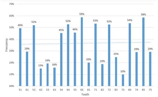 In the lower arch in the deciduous dentition, the central incisor was the most affected, with a caries rate of 53.3%, followed by the primary first molar, with a rate of 53.7%. These findings are shown in a graph that clearly visualizes the distribution of caries in the different teeth evaluated (Figure 2).