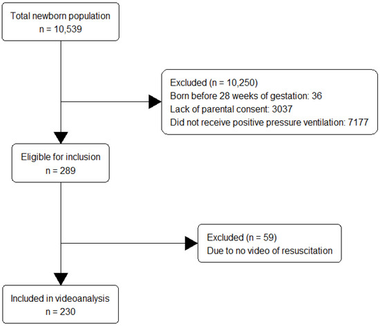 In total, 10,539 newborns were born during the study period, of which 10,503 with gestational age ≥28 weeks. Of these, 7466 (71%) parents agreed to participation, of which 289 (3.9%) received PPV at birth. The resuscitation was captured on video in 230/289 cases, and these newborns were included in the analysis. A flow diagram of over participants and patient characteristics is shown in Figure 1 and Table 1, respectively.