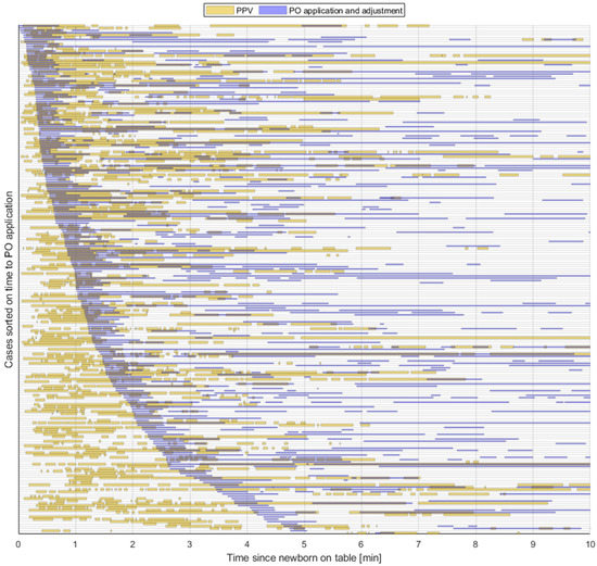 The figure shows 222 newborns that received PPV at birth and had PO applied. Each horizontal line represents a newborn from the time of placement on the resuscitation table (time = 0) and the first consecutive ten minutes. Provision of PPV is illustrated in orange lines. Application and/or adjustment of PO is illustrated in blue lines. Newborns are sorted by time from placement on the resuscitation table to start application of PO. PPV = positive pressure ventilation, PO = pulse oximetry.
