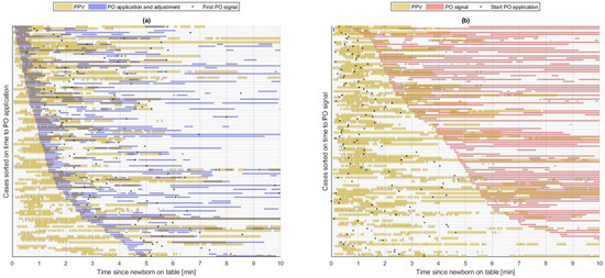 The figure shows the 118 newborns where video of the PO monitor was available. Each horizontal line represents a newborn from the time of placement on the resuscitation table and throughout the first ten minutes. (a) shows the application and adjustment of PO illustrated in blue lines in relation to PPV in orange lines, and time when the first PO signal was displayed illustrated as a black dot. (b) shows the proportion of time with a PO signal illustrated in pink lines in relation to PPV illustrated in orange lines. The black dot represents the start of PO application. PPV = positive pressure ventilation, PO = pulse oximetry.
