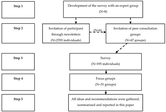 All participating groups received a detailed review of the literature as background material and PowerPoint presentations to give guidance about what to focus on in the two focus group meetings. During the two meetings, individual and group ideas, opinions, and recommendations were gathered. The results were summarized and reported for each meeting by a member of the focus group acting as a contact person for the research group.