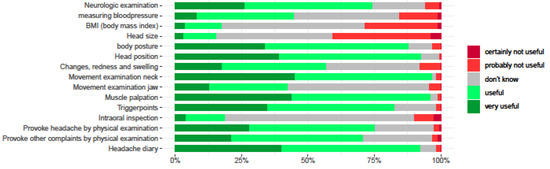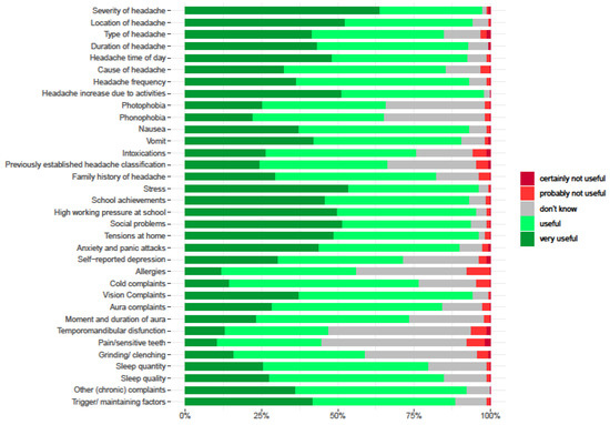 Across all anamnestic topics, the percentage of participants that considered a specific topic (very) useful varied between 45% and 98%. Most participants found it useful to ask their patient if daily activities increased their headaches (98%). Other useful questions were aimed at gaining information about the severity (97%), location (94%), duration (93%), and frequency (93%) of headaches and about stress (96%). The questions that the least number of participants found useful to ask were about temporomandibular disorders (53%) or pain/sensitivity in the teeth (55%). Figure 2 depicts all incorporated anamnestic items of the survey and their percentages of usefulness.