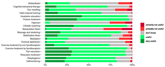 The treatment items considered least useful were manipulations of the neck (33%) and dry needling (20%), and items considered unknown in a physical therapeutic setting were provision of occlusal appliances (69%), hypnosis (67%), and meditations (58%). The usefulness of the physical therapy treatment items by percentage is presented in Figure 4.