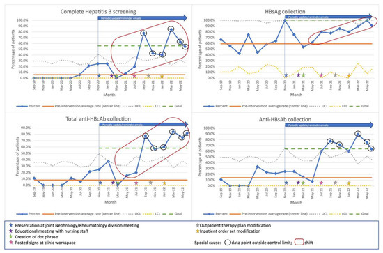 Statistical process control charts plotting the proportion of patients screened for chronic or past Hepatitis B virus infection and use of individual screening components over calendar time. Interventions are marked by star shapes and described in the bottom panel. Non-random distributions were identified as data points above the upper control limit and/or a shift in all charts. Center line recalculation after a shift is not depicted as it corresponds to the post-project completion period. Upper control limit shown as 100 if ≥100. Lower control limit shown as 0 if ≤0. Abbreviations: anti-HBcAb: hepatitis B anti-core antibody; anti-HBsAb: Hepatitis B anti-surface antibody; HBsAg: Hepatitis B surface antigen; LCL: Lower control limit; UCL: Upper control limit.