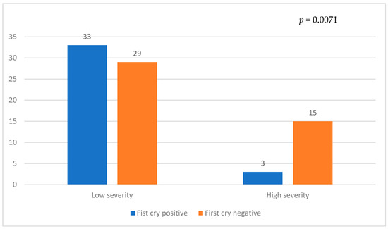 Among the severity groups, the presence of first cry was observed in 33 patients in the Low severity group and 3 patients in the High severity group, whereas the absence of first cry was noted in 29 patients in the Low severity group and 15 patients in the High severity group (Figure 3). There was a significantly higher occurrence of the first cry in the Low severity group compared to the High severity group (p = 0.0071).