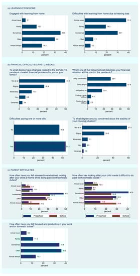 Distribution of parent responses to survey questions about (a) learning from home, (b) financial difficulties, and (c) parent difficulties during the COVID-19 pandemic.