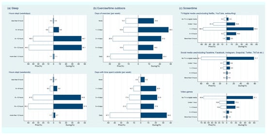 Child daily activities ((a) sleep, (b) exercise, and (c) screen time) prior to and during the COVID-19 pandemic.
