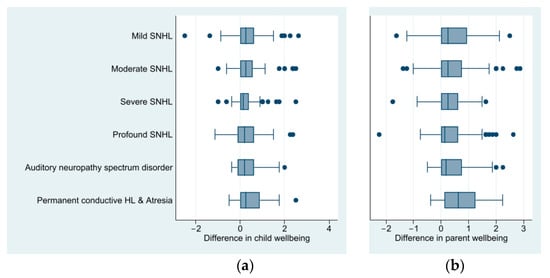 Difference in (a) child and (b) parent socio-emotional wellbeing scores during compared to before the pandemic, measured using the eight-item CRISIS emotions/worries scale, with a shift to the right indicating poorer wellbeing, i.e., a higher level of emotions/worries during the pandemic. HL: hearing loss; SNHL: sensorineural hearing loss.