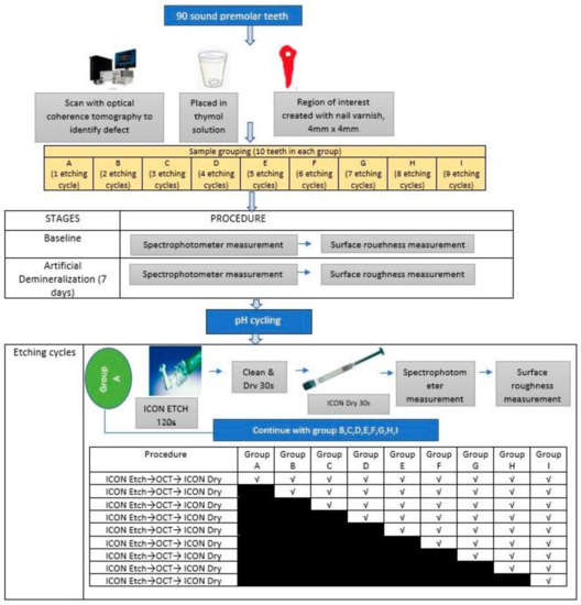 The approval to conduct the study was granted by The Research Ethics Committee of Universiti Teknologi Mara (UiTM) with the approval code REC/08/2020 (MR/220, 15 September 2020). In this in vitro study, power analysis (using Axum 7 (Mathsoft, Cambridge, MA, USA)) was carried out with an alpha of 0.05 and a power of 0.9 (sigma 1 = 10.00, sigma 2 = 11.35; mean 1 = 35.95, mean 2 = 49.37) which resulted in a sample size of 90 [13]. The inclusion criteria include sound premolar tooth extracted for orthodontic treatment with intact buccal surface. Teeth with caries, developmental defects of enamel (Amelogenesis imperfecta, Dentinogenesis imperfecta, fluorosis, molar incisor hypomineralization) or presence of restoration were excluded. All teeth were coated with nail varnish (Revlon, New York, NY, USA) leaving a 4 mm × 4 mm square which was treated as region of interest (ROI) on the midbuccal surface of experimental teeth. Only this window was exposed for the induction of artificial lesions. Teeth were stored at room temperature in a 0.1% thymol solution (BDH Chemicals Ltd., Poole, England) to prevent dehydration and additional microbial growth. The specimen was randomly selected and further divided into nine groups (A-I). Each group consists of 10 teeth samples. The difference between each group is the number of etching cycles. For example, teeth in Group A were undergo one etching cycle while teeth in Group B were treated with an additional etching cycle (2 cycles). Each group was subjected to acid etching application (15% HCl; ICONTM Etch) followed by resin infiltrant treatment application (ICONTM Infiltrant). The infiltrant was allowed to penetrate for 3 min, air-dried and light cured for 40 s (Resin 1). The lesion was infiltrated for an additional 1 min and light cured for 40 s (Resin 2). Then, the resin was polished with 11,000 rpm fine and superfine polishing disc (Soft-Lex, 3M). Figure 1 showed the workflow of the study.
