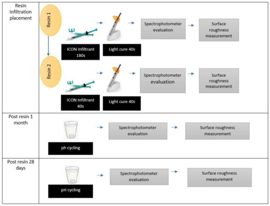 Following artificial demineralization, the teeth underwent pH cycling. Using pH cycling, an artificial caries lesion was created to simulate the intraoral situation characterized by alternating demineralization and remineralization processes. The pH cycling model utilized in this study, known as the modified Featherstone model [15], consisted of immersing all samples for 6 h in a demineralization solution containing 2.0 mM calcium nitrate tetrahydrate, 2.0 mM monopotassium phosphate, 75.0 mM acetic acid and sodium hydroxide. After demineralization, all samples were immersed for 17.5 h in a remineralization solution containing 1.5 mM calcium nitrate tetrahydrate, 0.9 mM monopotassium phosphate, 130.0 mM potassium chloride, 20.0 mM sodium cacodylate, and hydrochloric acid at a pH of 7.0. The demineralization and remineralization procedures were alternated and repeated for up to 28 days [16]. The profilometer and spectrophotometer scans were performed prior to pH cycling (to obtain baseline measurement) and at various stages (post-etching, resin 1 and resin 2, 7 days, and 28 days post resin applications).