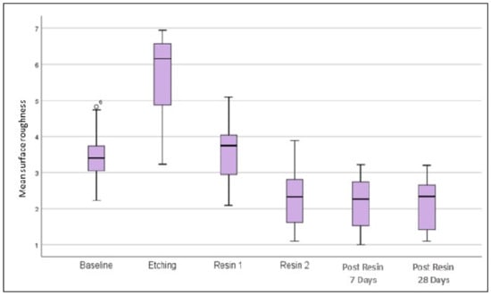 All specimens were scanned and analyzed for surface roughness using a high surface stylus profilometer Ambios XP-200 (Ambios Technology, Inc., Milpitas, CA, USA). The stylus profilometer consisted of a vertical measurement range of 800 µm, a scan length range of 50 mm, and a stylus tip radius of 2.5 µm. To gather the surface profile data, a total scan length of 5 mm was performed at a scan speed of 0.03 mm/s [18]. Average roughness values (Ra, µm) were determined for each specimen after three measurements undertaken at six evaluation stages (baseline, post etching, resin 1, resin 2, post resin 7 days, and post resin 28 days).