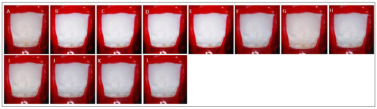 Image of the ROI at different stages: (A) Baseline, (B) Demineralization, (C) Etching cycle one, (D) Etching cycle two, (E) Etching cycle three, (F) Etching cycle four, (G) Etching cycle five, (H) Etching cycle six, (I) Etching cycle seven, (J) Etching cycle nine, (K) Resin 1, and (L) Resin 2.