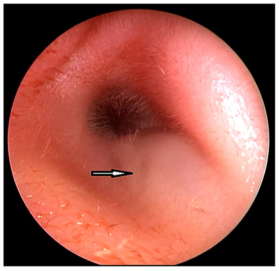 Preoperative endoscopic view of the external auditory canal: bulging of the skin with a visible sinus ostium (arrow).