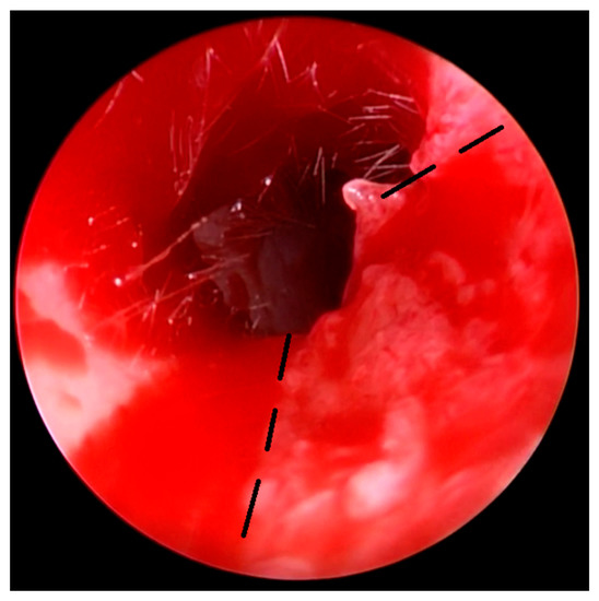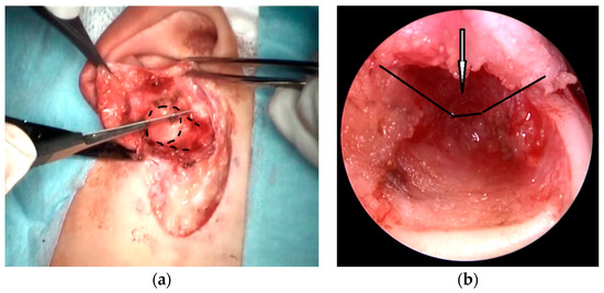 The anatomical relationship between the lumen of the EAC and the lumen of the abnormality: opening of the cartilaginous duplicated EAC (dotted line) (a); inside the duplicated EAC—endoscopic view on the party wall (arrow) (b).