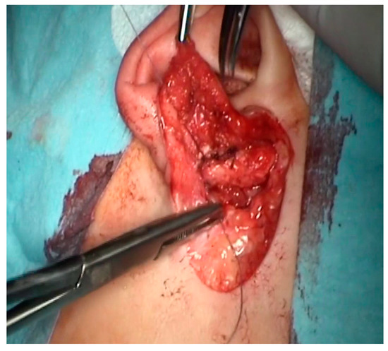 Surgical technique: The aim of the technique was to provide an adequately wide and self-cleaning external auditory canal. The external U- (Figure 2), Y-, or S-shaped approach was implemented depending on the presence of a buccal or a mandibular mass and/or an opening of the sinus/fistula. After the dissection of the distal part of the abnormality (if present) or the opening of the duplicated EAC (Figure 3a), the relationship between the lumen of the EAC and the lumen of the abnormality was visualized (Figure 3b). Prior to the resection, a longitudinal or a spindle communicating incision along the party wall was carried out (Figure 4). Then, depending on the local situation, the defective skin of the EAC and the superior part of the abnormality (including cartilage if present) were resected (Figure 5). The superior part of the abnormality was removed adequately to the skin loss in the EAC. Generally, a resection of up to ½ of its circumference is required. The continuity of the EAC lumen was reconstructed (Figure 6) using the remaining part of the abnormality (usually its inferior wall) and stabilized with absorbable sutures remaining outside the lumen of the EAC (Figure 7). An ear gauze package with an ointment (Oxytetracyclini hydrochloridum and Hydrocortisonum) was placed in the external auditory canal for 3 weeks in each case.