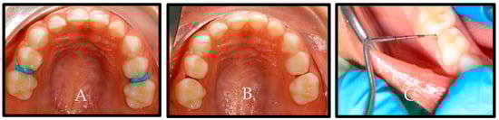 Clinical examination steps. (A) Separators in place for two days.; (B) separators removed after two days, and space created; and (C) CPI probe was used to verify cavitation.