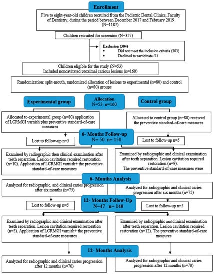The purpose of this study was to compare the additive effect of the LCRMGI varnish with the preventive standard-of-care measures (an application of 5% of sodium fluoride varnish (NaF), oral hygiene instructions (OHI), and dietary counseling) to the preventive standard-of-care measures alone, on promoting the regression or inhibiting the progression of non-cavitated enamel and outer dentine proximal carious lesions in primary molars evaluated by bitewing (BW) radiographs and direct visual clinical examination after six and twelve months. We hypothesized that the success rate of the LCRMGI varnish (with the preventive standard-of-care measures) would be higher than that of the preventive standard-of-care measures alone.