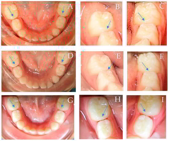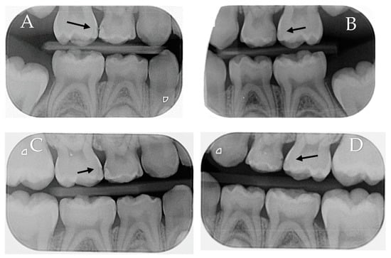 The third screening phase was comprised of a direct visual clinical examination to assess the cavitation status of the proximal carious lesions that were deemed qualified in the second phase. To enable direct visual clinical examination of the proximal surfaces, orthodontic elastic separators were placed in the eligible interproximal areas. The children returned after two days, and the temporary separators were removed. The selected proximal surfaces were cleaned using a prophy cup (Prophy Cup, Snap-on, Guangzhou Jaan Medical CO., Guangzhou, Baiyun, China) and dental floss (Dental Floss, non-waxed, Oral-B Laboratories, Iowa City, IA, USA). The surfaces were examined by the gentle running of a community periodontal index (CPI) probe across the lesion to assess cavitation. Figure 1 shows an illustration of the clinical examination steps. Then, carious lesions were clinically scored, from the lingual, buccal, and occlusal sides, with the International Caries Detection and Assessment System II (ICDAS II) [16], with a score of (0) indicating clinically sound surfaces; (1 and 2) were non-cavitated lesions with score 1 lesions requiring air-drying to see the lesion, while the lesion could be seen without air-drying in score 2; (3) there was a localized breakdown in the enamel because of caries, but the dentin was not visible; (4) had a dark underlying dentin shadow with or without a localized enamel breakdown; (5 and 6) had dentine cavitation with increasing stages. The surfaces were scored by the two trained and calibrated examiners independently (.JK. and O.F.). If there was disagreement in the scores between the first two examiners, a third (S.B.) calibrated and trained examiner was asked to assess the lesion. The Kappa’s values for the inter-examiner (0.869) and intra-examiner reliability (0.867–0.870) for the direct visual clinical examination indicated very good agreement between the examiners. During the clinical examination, all examiners were blinded to the radiographic score of the lesions. Any child diagnosed with a cavitated proximal carious lesion (ICDAS II score of 3 or more) by at least two of the examiners was excluded and referred for restorative treatment. Children with at least one pair of primary molars in contralateral quadrants with matching non-cavitated proximal carious lesions diagnosed radiographically as E1, E2, and D1 and clinically as an ICDAS II score of 1 or 2 were considered eligible for the study.