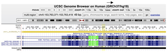 Figure 2. Screenshot of the Mediterranean G6PD mutation as demonstrated in https://genome.ucsc.edu/, accessed on 12 June 2023); the NM_001360016.2(G6PD): c.563C>T (p. Ser188Phe) (yellowish column) with its specific isoform nomenclature.