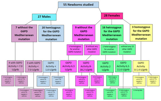 In the 27 male newborn infants’ group, 20 males were hemizygous to the Mediterranean mutation (NM_001360016.2(G6PD): c.563C>T (p. Ser188Phe)) and seven did not have this mutation. All 20 hemizygous males with the Mediterranean mutation had very low G6PD activity of less than 1 U/gHb. The number of TA repeats in the UGT1A1 promoter were 7/7 in three (abnormal homozygous), nine were heterozygous with 6/7 repeats, and eight were normal with 6/6 repeats. Among the seven males who were not found to have the Mediterranean G6PD deficiency mutation, three had G6PD activity lower than 7 U/gHb (in the range of 5–6.5). In this group of three, full sequencing of the G6PD gene was performed and other mutations of G6PD were found. Two of these infants were normal with 6/6 TA repeats in the UGT1A1 promoter, and one was heterozygous with 6/7 repeats. The four other male infants without the Mediterranean or any other G6PD mutation had normal G6PD activity above 7 U/gHb. Three of these infants were normal with 6/6 TA repeats and one was heterozygous with 6/7 TA repeats in the UGT1A1 promoter (Figure 3).