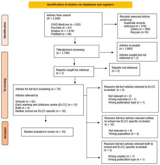 Our initial search, including both schools and ELCCs (Figure 1), found 2010 eligible articles (PsycInfo: n = 61; Scopus: n = 1414; OVID-MedLine: n = 535). De-duplication via Zotero removed 299 articles, and Rayyan software (Qatar Computer Research Institute, Doha, Qatar) [30] removed 10 articles. A total of 1701 articles were screened for titles and abstracts by two independent reviewers (initials blinded for review). No disagreements were found between screeners during the initial process. Full-text screening (n = 77) was completed for articles deemed eligible with consideration to the study methods, participants, outcomes of interest, and results. Of these 77 articles, 15 were deemed related to ELCCs. Two reviewers screened full-text English articles (n = 75), while French articles (n = 2) were screened by one reviewer.