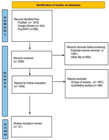The initial search of the databases found 2598 papers. After removing all duplicate and “other title subject” papers, as well as abstract-only papers, 1558 remained to be evaluated further. Then, 1546 papers were removed, as they were reviews, systematic reviews, meta-analyses, letters to editors, or quantitative design surveys. Finally, only 12 papers were included in this systematic qualitative synthesis (Figure 1).