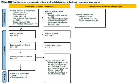 The search resulted in 2327 records, of which 859 were duplicates. A total of 1469 records were screened for eligibility using the title and abstract, and 1323 were excluded. The full texts of the remaining 145 reports were sought, but three articles were unavailable online and difficult to access, and thus were excluded from the review. The remaining 142 full texts were assessed for eligibility, and 79 were excluded. Exclusion reasons included lack of a full study report (conference abstract), not being specific to the pediatric population, study design/outcome did not orientate to inclusion criteria, and studies that did not involve context to pACP process, documentation, or implementation. Sixty-four articles met the criteria mentioned in Section 2.1.1 [8,9,16,17,18,19,20,21,22,23,24,25,26,27,28,29,30,31,32,33,34,35,36,37,38,39,40,41,42,43,44,45,46,47,48,49,50,51,52,53,54,55,56,57,58,59,60,61,62,63,64,65,66,67,68,69,70,71,72,73,74,75]. See Figure 1 for the PRISMA flow diagram of the study selection process.