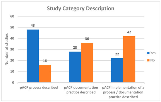 Forty-eight studies described the pACP process, twenty-eight described documentation practices, and twenty-two described an implementation of a pACP process and/or documentation practice, see Figure 2. Articles came from a variety of regions: the USA (n = 24), the UK (n = 14), Germany (n = 5), Canada (n = 5), Australia (n = 4), the Netherlands (n = 5), Belgium (n = 1), Taiwan (n = 1), and Australia/Brazil (n = 1). Over one-third of the studies/articles originated from the United States, and almost all studies were from the Western world perspective.