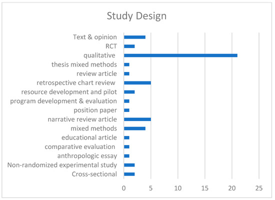 A wide range of studies were included: cross-sectional (n = 2), non-randomized experimental study (n = 2), anthropologic essay (n = 1), comparative evaluation (n = 1), educational article (n = 1), mixed methods (n = 4), narrative review article (n = 5), position paper (n = 1), program development and evaluation (n = 1), resource development and pilot (n = 2), retrospective chart review (n = 5), review article (n = 1), mixed methods thesis (n = 1), qualitative (n = 21), RCT (n = 7), systematic review (n = 2), and text and opinion (n = 4); see Figure 3.