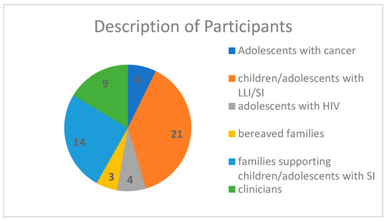 Over half of the articles collected included the perspective of the family or the family voice in combination with clinicians (limited child involvement). Of the studies that included participants, the descriptions of participants were as follows: adolescents with cancer (n = 4), children/adolescents with life limiting illnesses (LLI)/serious illness (SI) (n = 21), adolescents with human immunodeficiency virus (HIV) (n = 4), bereaved families (n = 3), families supporting children/adolescents with SI (n = 14), and clinicians (n = 9); see Table 1. Note that majority of studies that included the adolescent population as a descriptor and are depicted in Figure 4 and Table 1, the actual age range was beyond the known boundaries of adolescence. The studies retrieved that included the children/youths/adolescents and young adults (AYA) involved, or parents of a child/youth/AYA range was 0–35 years, with one study regarding Duchenne muscular dystrophy ranging as high as 45 years. A brief description of each article can be found in the Supplemental Material, along with some age ranges.